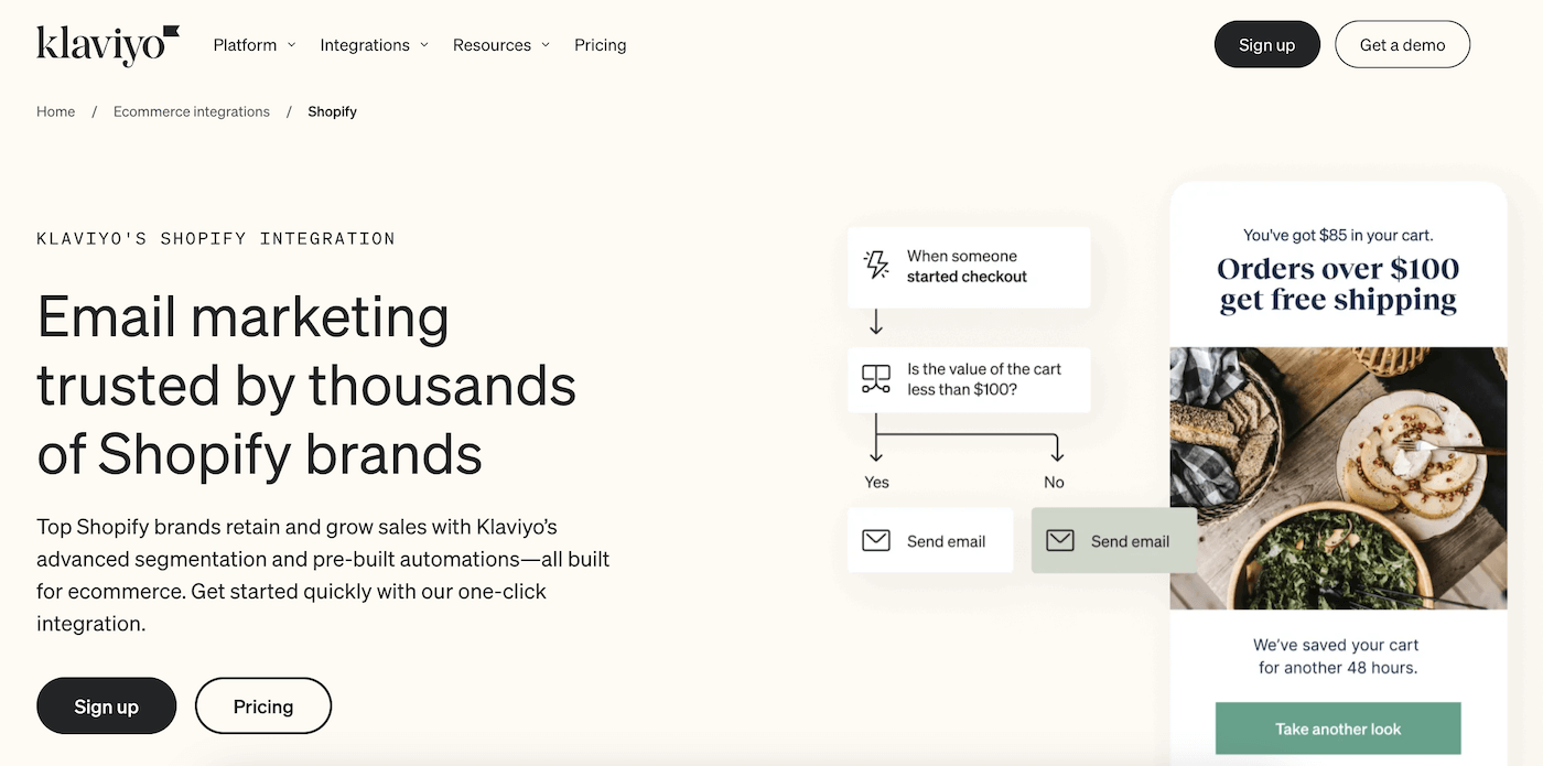 Klaviyo ist eine spezielle Marketing-Software für E-Commerce – weshalb sie sich hervorragend für Shopify Shops eignet. Auf seiner Website gibt Klaviyo an, dass mehr als 8.500 Shopify Plus-Besitzer:innen – also große Businesses aus dem B2B und B2C-Bereich – Klaviyo als ihre bevorzugte E-Mail-Marketinglösung nutzen.