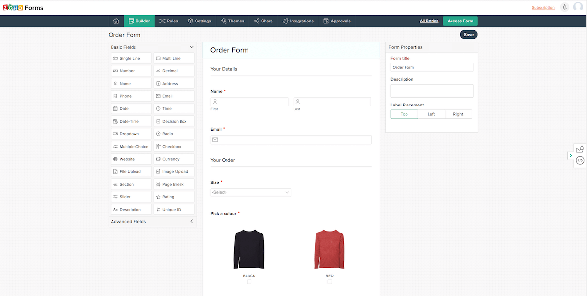 Zu beachten ist, dass Sie in Zoho Forms keine Banner, Gamification oder Rubbellose finden werden, sondern nur längere Formulare praktischer Natur wie Bestellformulare, Formulare für Bewerbungen, Veranstaltungsanmeldungen, Anfragen für Referenzen usw.