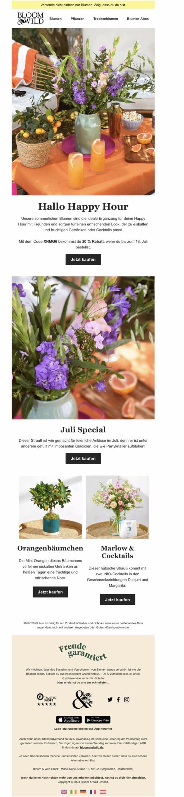 Der Blumenservice „Bloom & Wild“ weist seine Abonnent:innen in diesem Newsletter auf eine Rabattaktion hin. Die Inhalte wurden saisonal angepasst.