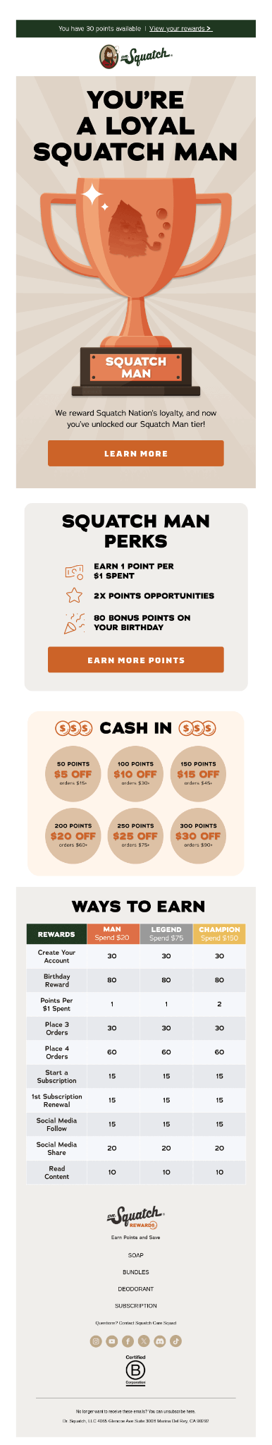 • Email customers about their loyalty points after they make a purchase and share the potential rewards they stand to earn.