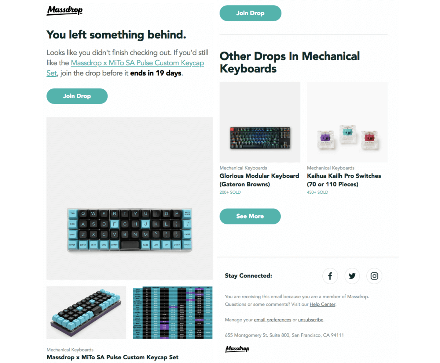 Here’s how DTC brand MassDrop (now called Drop) uses cross-selling to encourage its audience to increase their order value in this cart abandonment email:
