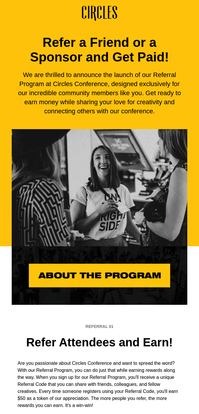 The Circles Conference encourages attendees to refer their event to friends and sponsors via its referral program (Source: Really Good Emails)