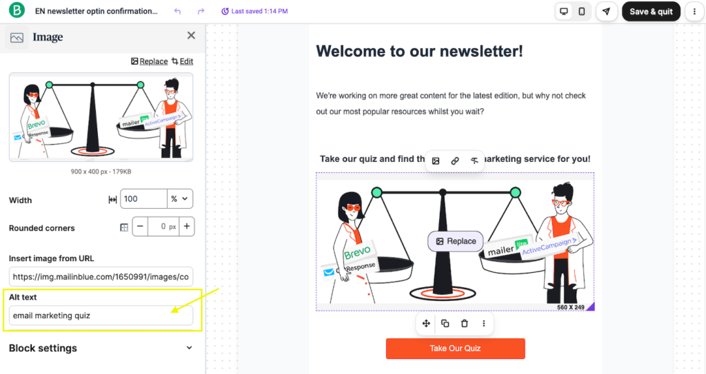 - Alt text – As images don’t always appear by default in emails, you should make sure you’re adding a short description (alt text) to your images. This is because sometimes email recipients will need to authorize the images before they appear as you designed them to. As most spammers won’t take the time to do this, applying alt text to your images will increase your chances of your emails being delivered.