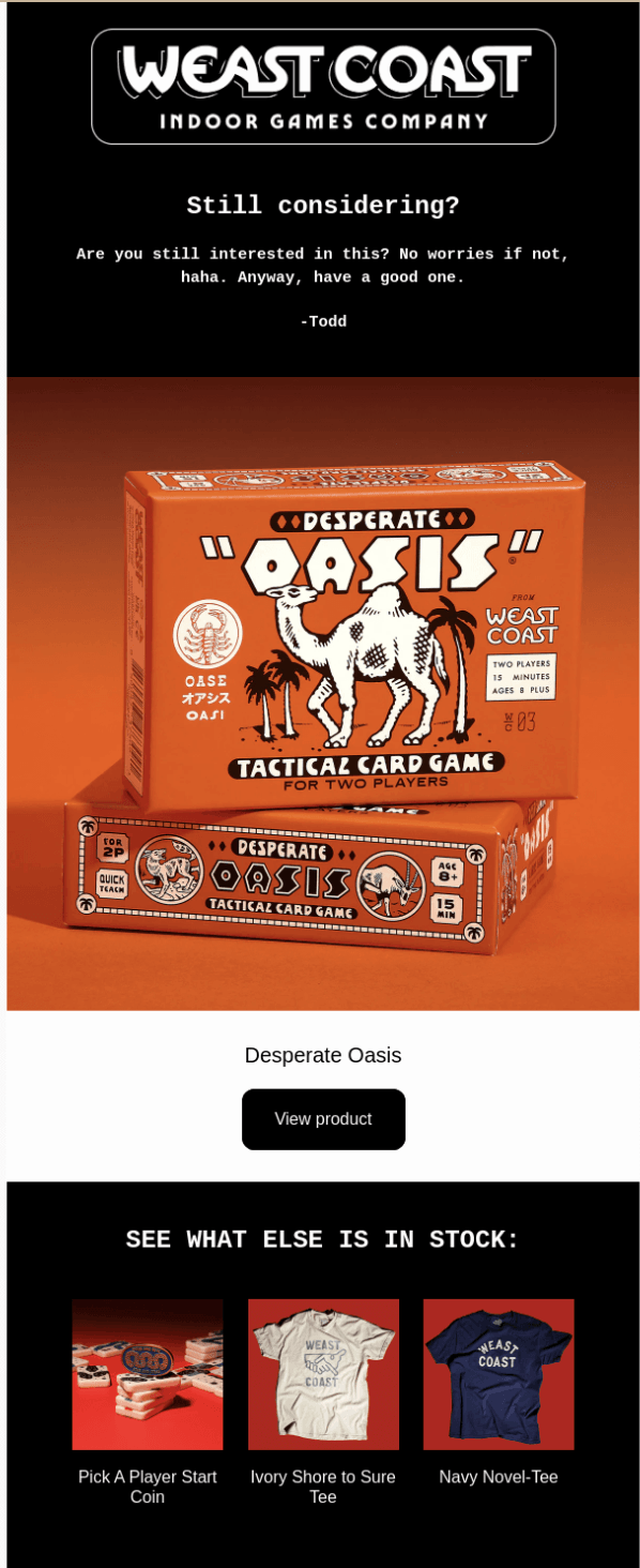 Cross-sell emails, on the other hand, suggest complementary products that naturally go along with their current choice. Weast Coast’s email here features three products that naturally complement the item the customer is already considering: