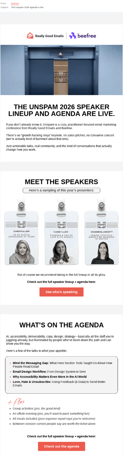 For instance, here’s Really Good Emails promoting their annual email marketing event, Unspam. They build anticipation by showcasing the speaker lineup and offering a preview of the agenda:
