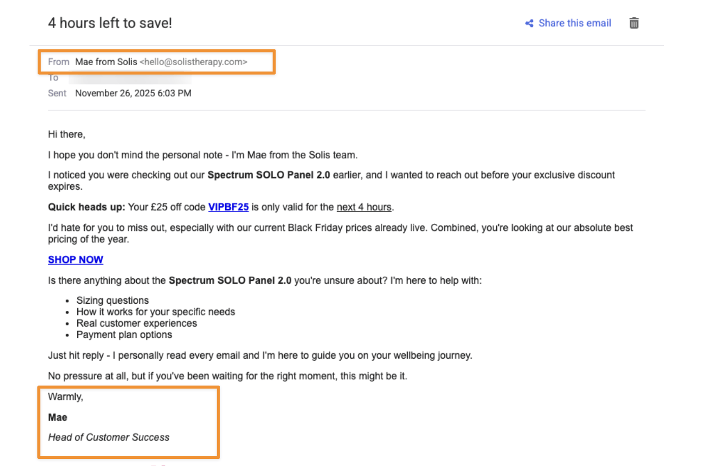 You can make your promotional emails sound more human by adding small touches like natural phrasing, a conversational tone, or simple personalization based on behavior. And if it makes sense for your brand, you could also send from a real name as Solis does: