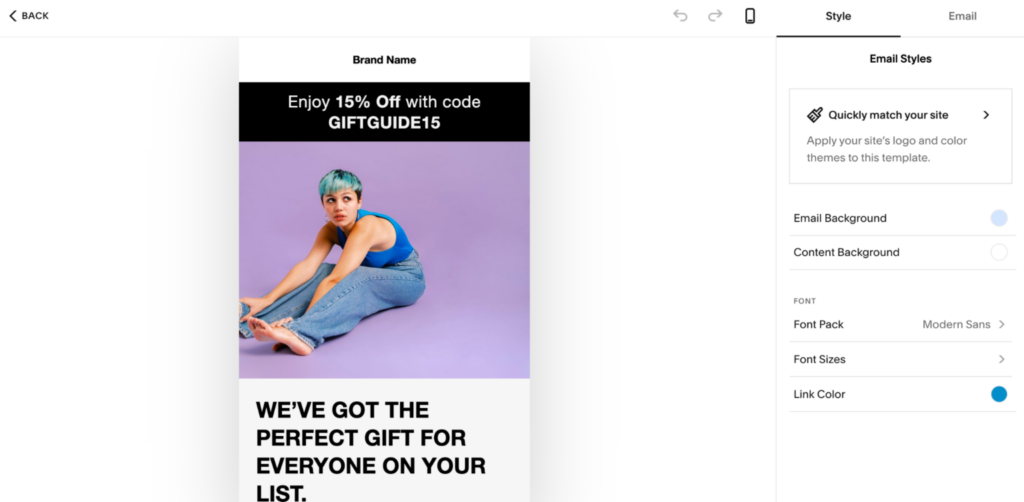 Once you select a template, you’ll be directed to the Email Editor. On the top right-hand side, you have the option to “Quickly match your site”. This is a very handy feature, enabling you to easily apply your site's logo and color themes to your email template.