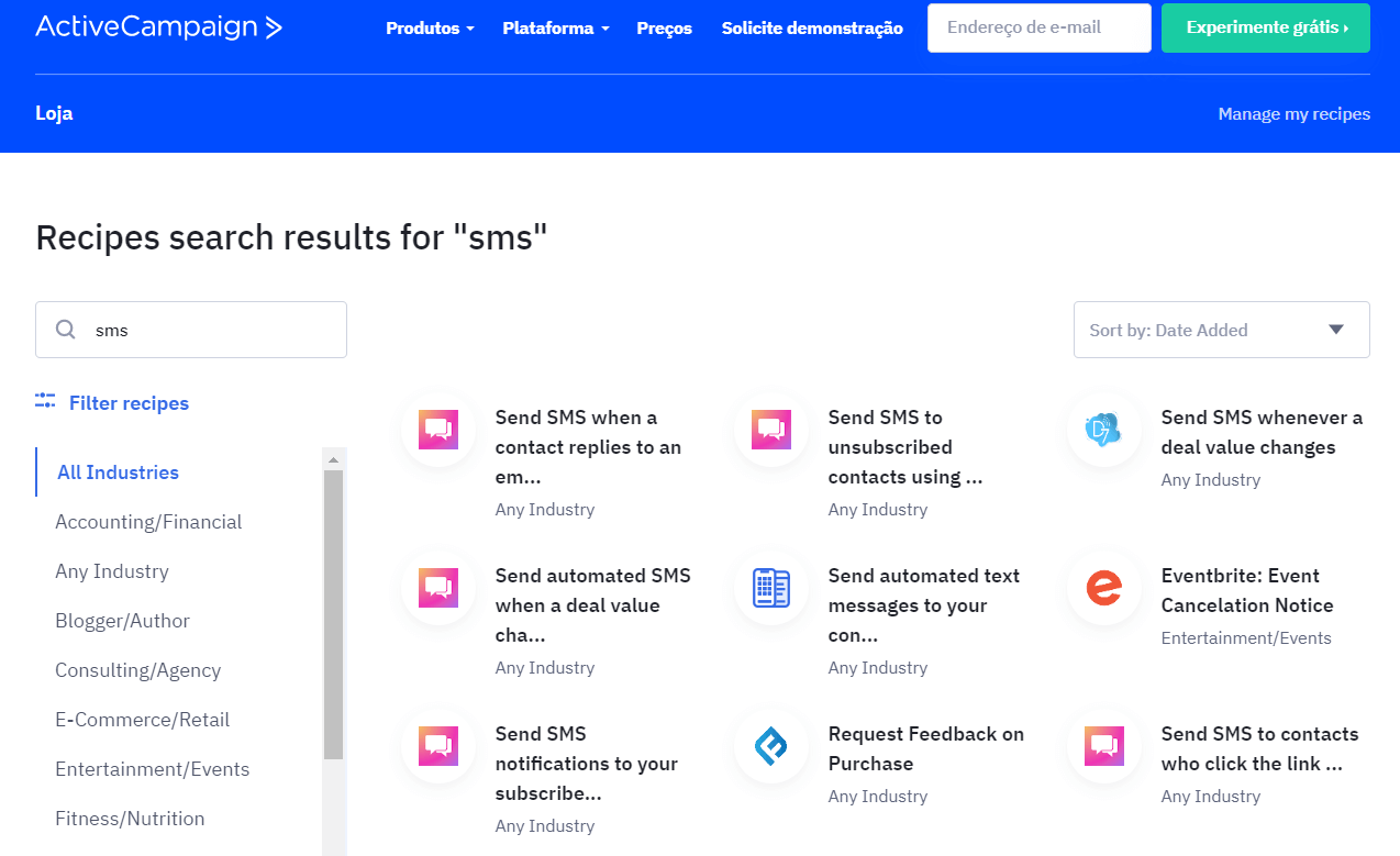 Automações de SMS estão inclusas no plano Plus e acima. Você pode integrar os SMS com diversas ferramentas como o ClickSend, MessageMedia e Twilio, e a ActiveCampaign novamente oferece uma variedade enorme de modelos: